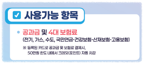 적용 가능한 항목은 전기, 수도, 도시가스, 국민연금, 건강 관련 비용 등으로 한정되어 있으며, 이를 제외한 개인 소비, 비업무성 지출에는 사용할 수 없습니다.