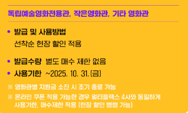 독립영화관이나 예술영화관 등 일부 소규모 극장은 온라인 발급 시스템이 없어 현장에서 선착순으로 할인 적용을 진행하므로, 해당 극장을 이용하실 분들은 미리 방문 일정을 조정해두시길 권장합니다.