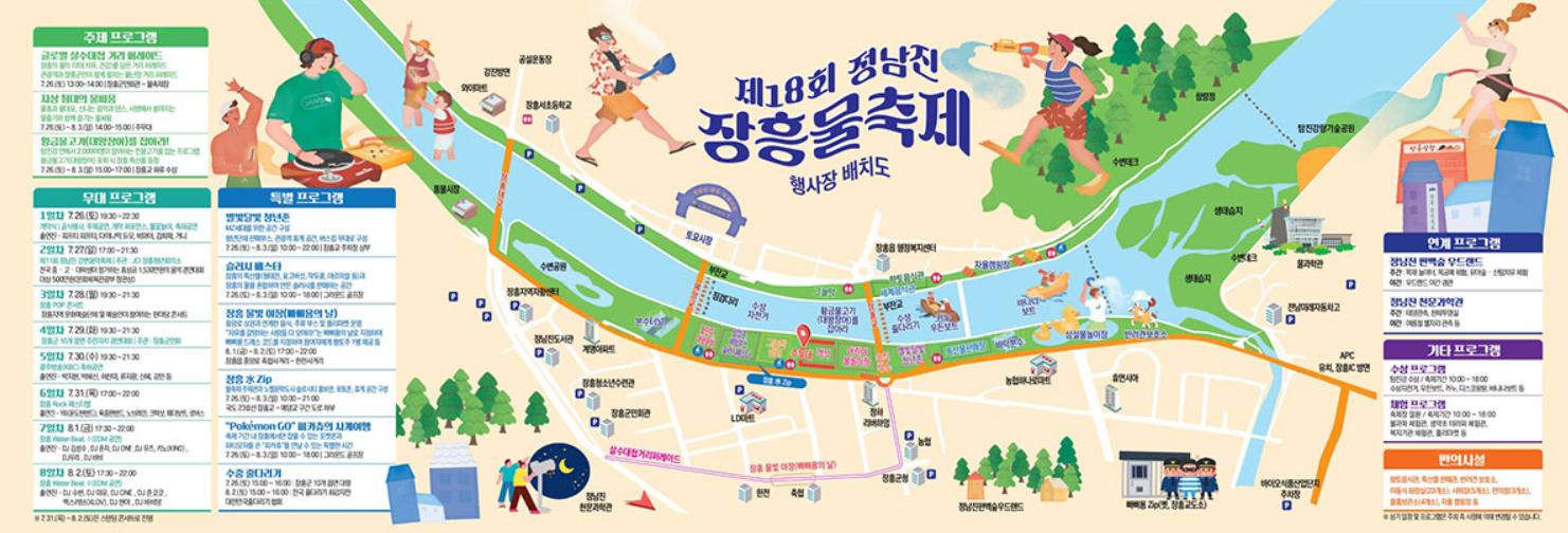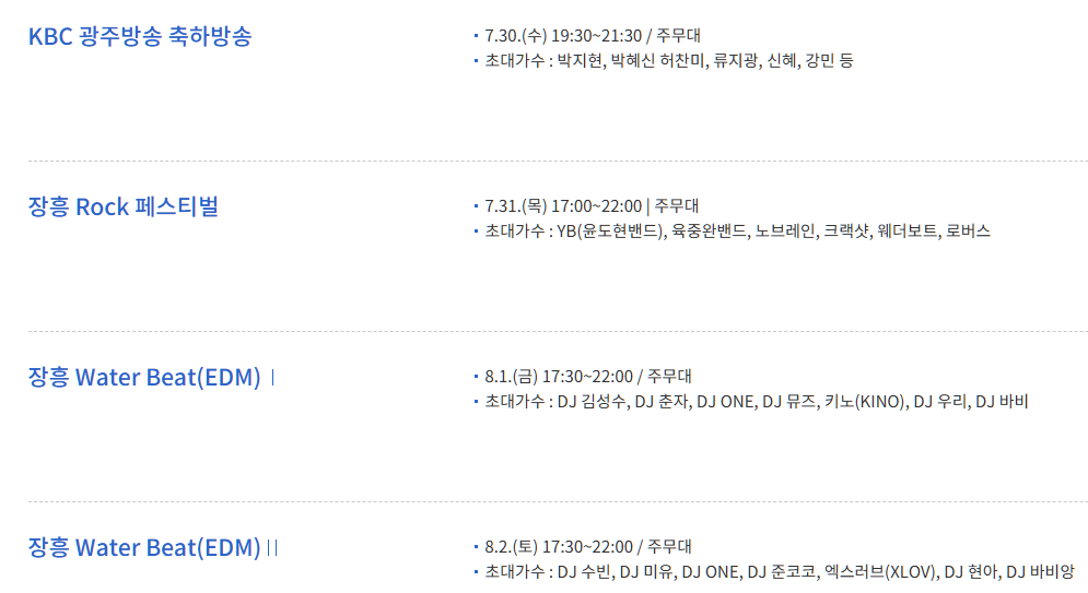 라인업은 매일 달라지며 일정에 따라 색다른 분위기를 느낄 수 있어 반복 방문에도 지루하지 않습니다. 여름밤의 시원한 강바람과 함께 음악을 즐기다 보면, 장흥 물축제가 왜 여름 대표 축제로 불리는지 직접 체감하실 수 있습니다.