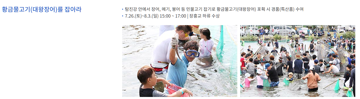체험은 매일 운영되며, 특별 이벤트는 특정 날짜에만 열리는 경우도 있으니 방문 전 일정을 확인하는 것이 도움이 됩니다. 장흥 물축제의 체험들은 단순히 재미에 그치지 않고 자연과 교감하거나 지역 문화를 느낄 수 있는 구성으로 되어 있어 아이들의 교육적인 체험으로도 적합합니다.