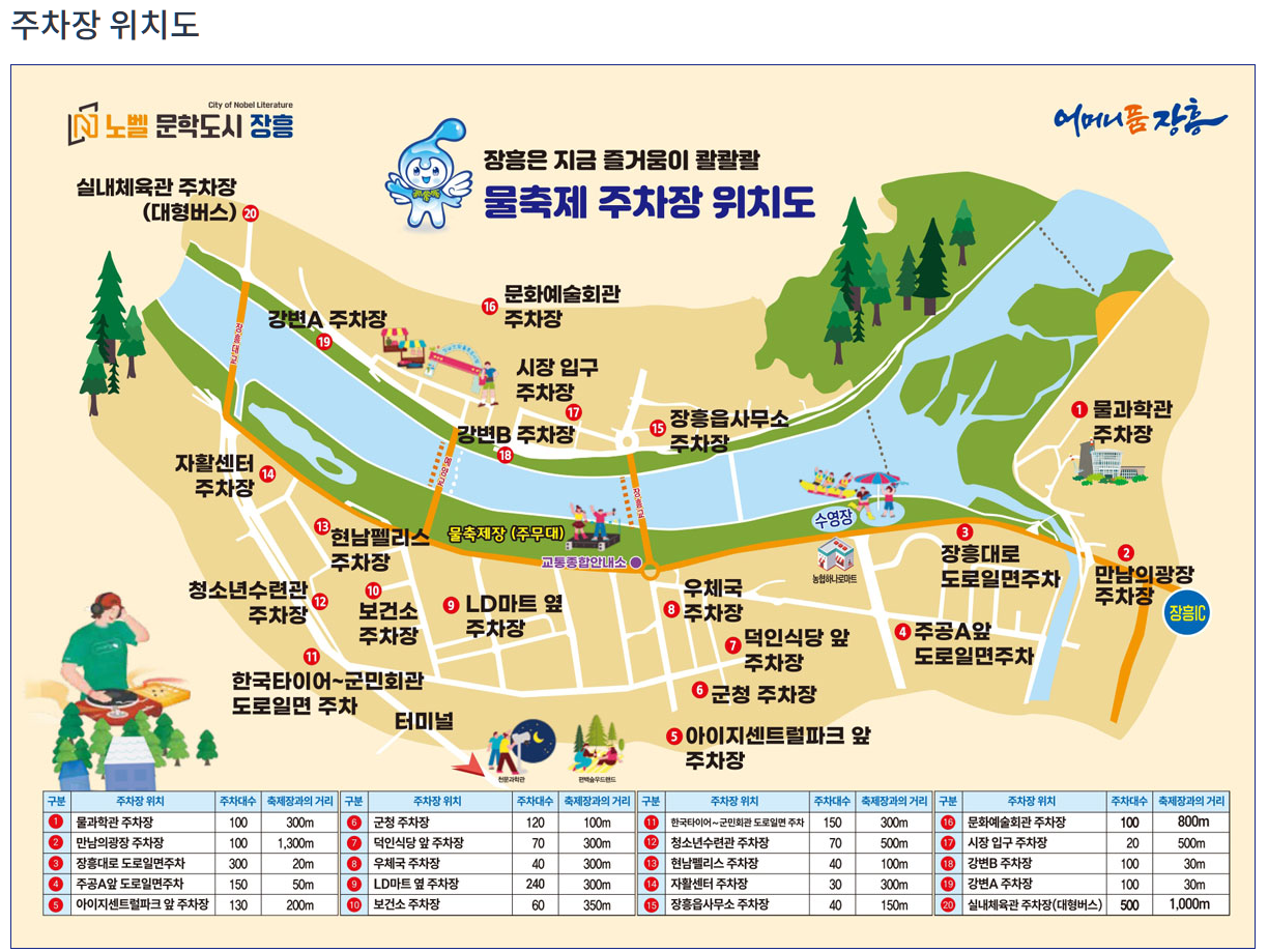 장흥 물축제에 방문하시는 분들을 위해 넉넉한 주차 공간이 마련되어 있습니다. 장흥군청, 탐진강 체육공원, 물과학관 등 총 15곳 이상의 지정 주차장이 운영되며, 대부분의 주차장에는 안내 요원이 배치되어 있어 혼잡 없이 차량을 유도받을 수 있습니다.