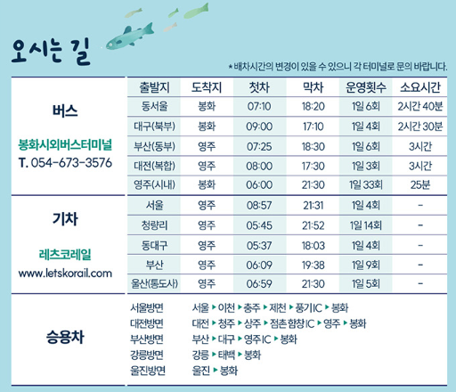 대중교통을 이용할 경우 영주역이나 봉화역에서 하차 후, 축제장에서 운영하는 무료 셔틀버스를 이용하면 행사장까지 쉽게 이동할 수 있습니다.