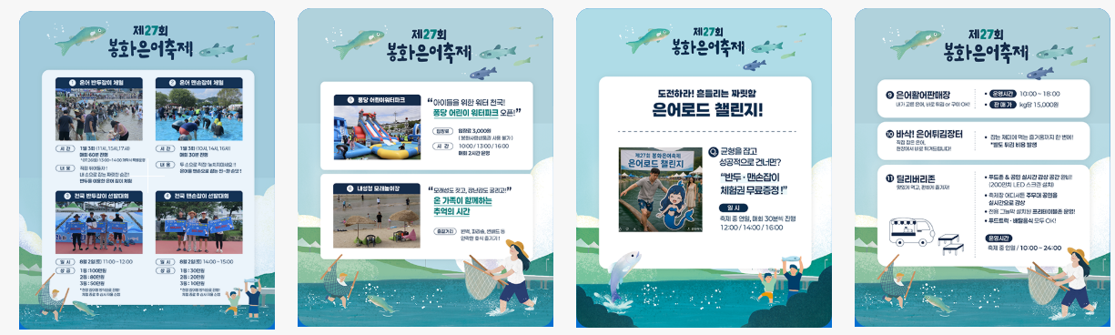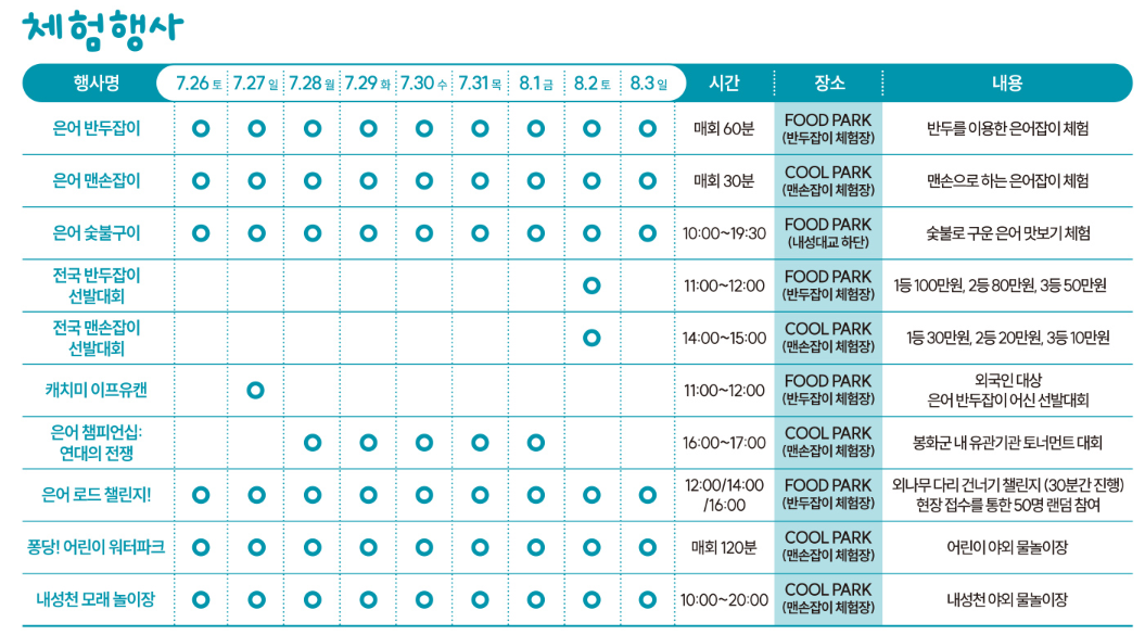 봉화 은어축제는 프로그램이 많아 하루만으로는 다 둘러보기 어렵습니다. 축제를 제대로 즐기기 위해선 시간대별로 구성된 일정표를 미리 확인하고 동선을 계획하는 것이 좋습니다.