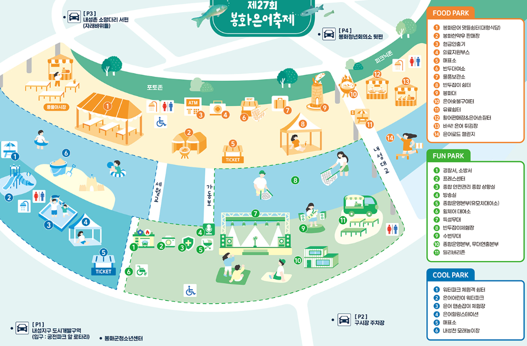 행사장 위치는 경상북도 봉화군 봉화읍 내성천 일원입니다. 자가용 이용 시 ‘봉화군청’ 또는 ‘봉화 공설운동장’을 내비게이션에 입력하면 축제장 인근의 임시 주차장으로 안내됩니다.