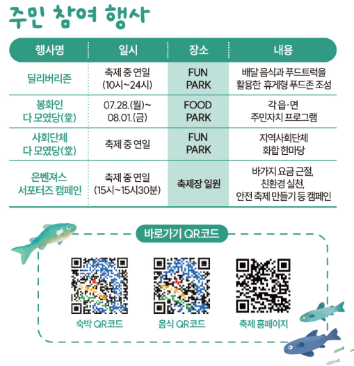 그 외에도 지역 청소년 댄스팀, 전통문화 공연, 주민 참여 무대 등 관람과 참여가 공존하는 라인업으로 꾸려져 있습니다. 축제 기간 중 방문 날짜에 따라 즐길 수 있는 공연이 다르기 때문에 사전에 스케줄을 확인해 두면 더욱 알차게 즐길 수 있습니다.