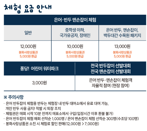 그러나 일부 체험 프로그램은 유료로 운영되며, 대표적으로 은어 맨손잡이 체험과 반두잡이 체험은 참가비가 필요합니다. 2025년 기준, 체험 참가비는 일반 성인 기준 10,000원이며, 어린이 및 할인 대상은 8,000원에 이용할 수 있습니다.