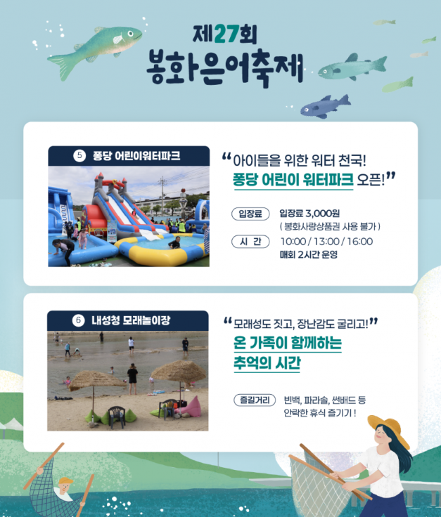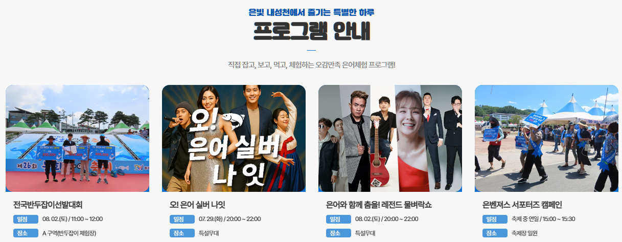 이외에도 어린이를 위한 ‘퐁당 워터파크’, 은어 모래놀이터, 지역 특산품을 소개하는 플리마켓, 전통공예 체험, 요리교실, 은어 퀴즈존 등 온 가족이 함께 즐길 수 있는 프로그램이 가득합니다. 행사장 전역에서 진행되는 다양한 볼거리와 체험은 은어 축제를 더욱 다채롭고 풍성하게 만들어줍니다. 한 번 방문한 이들이 매년 다시 찾게 되는 이유가 바로 여기에 있습니다.