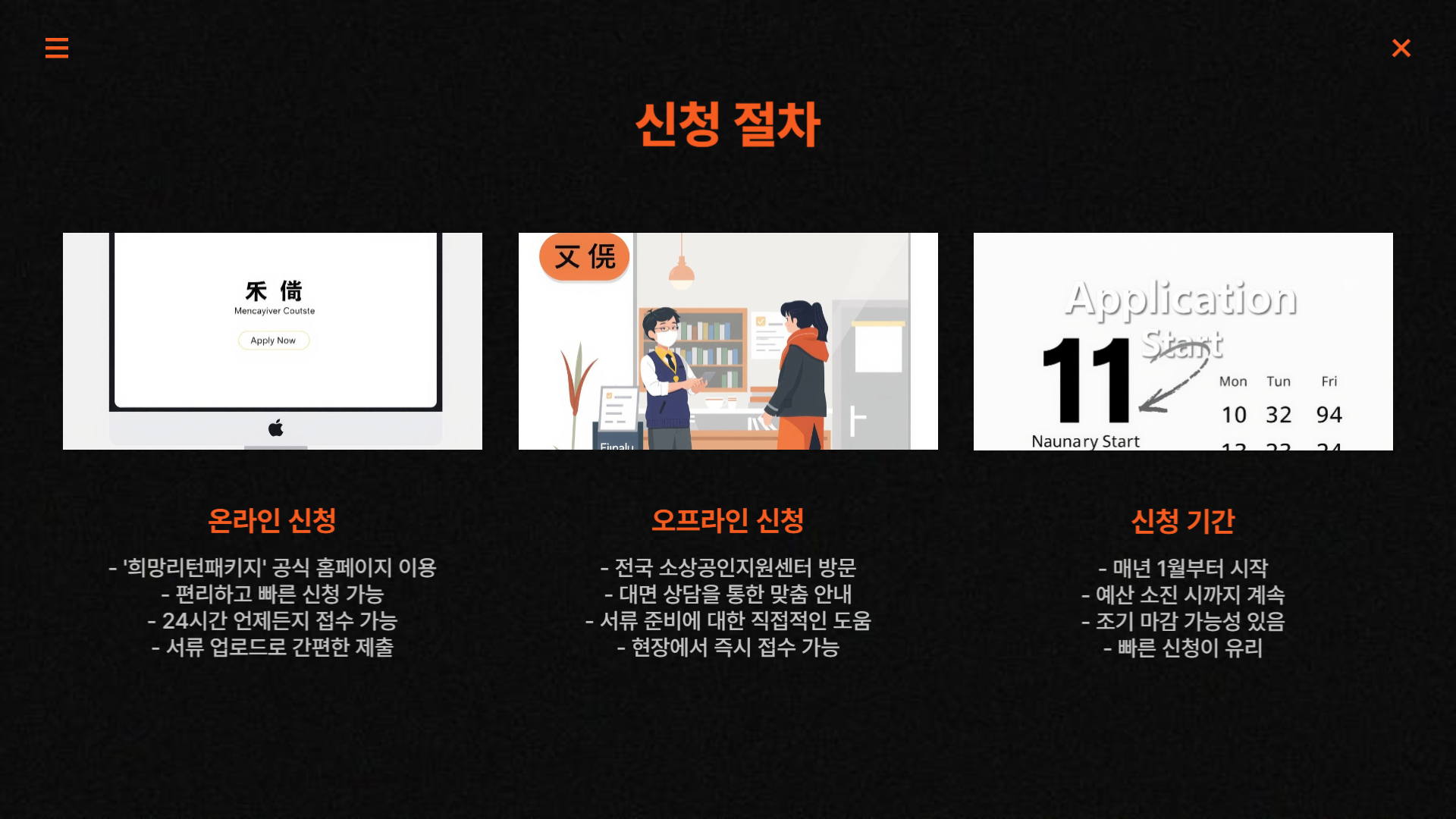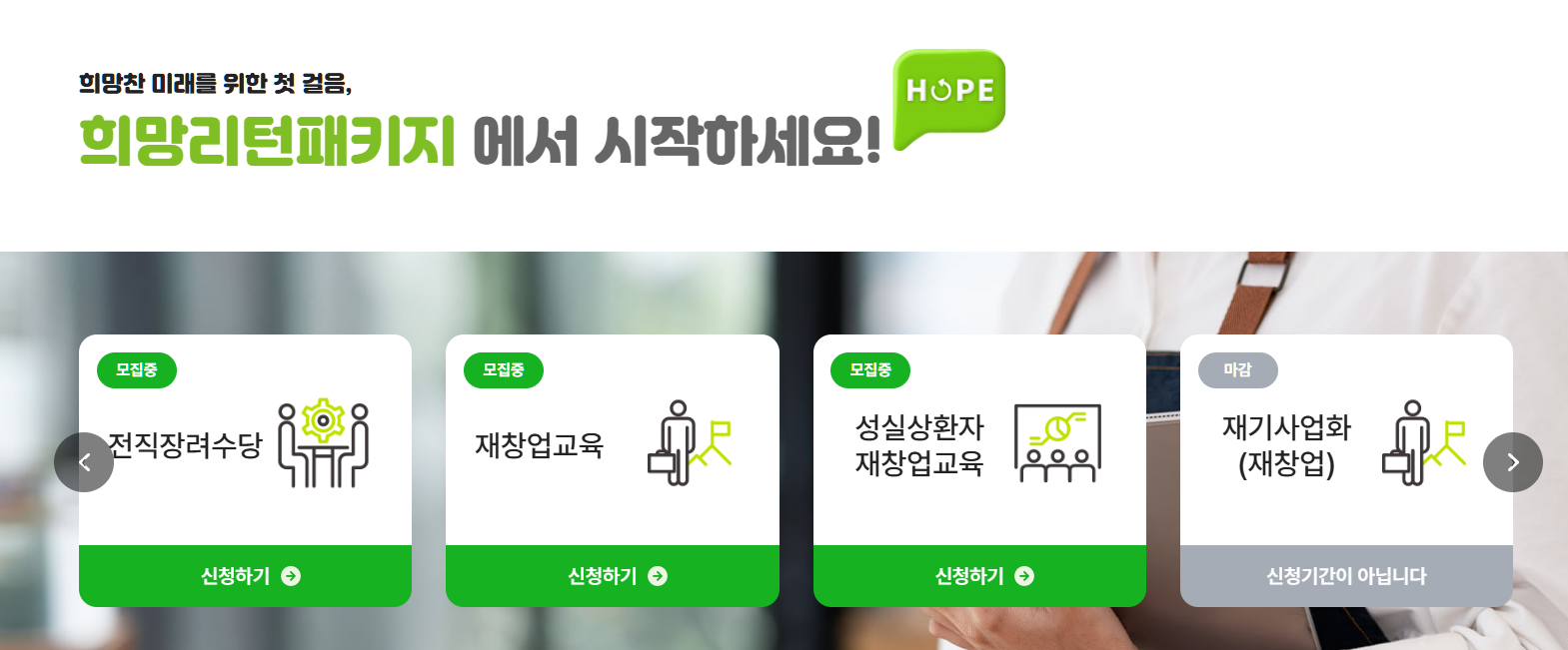 먼저 희망리턴패키지 누리집에 접속하여 지원 대상과 신청 조건을 확인합니다. 신청은 온라인과 오프라인 모두 가능하며,