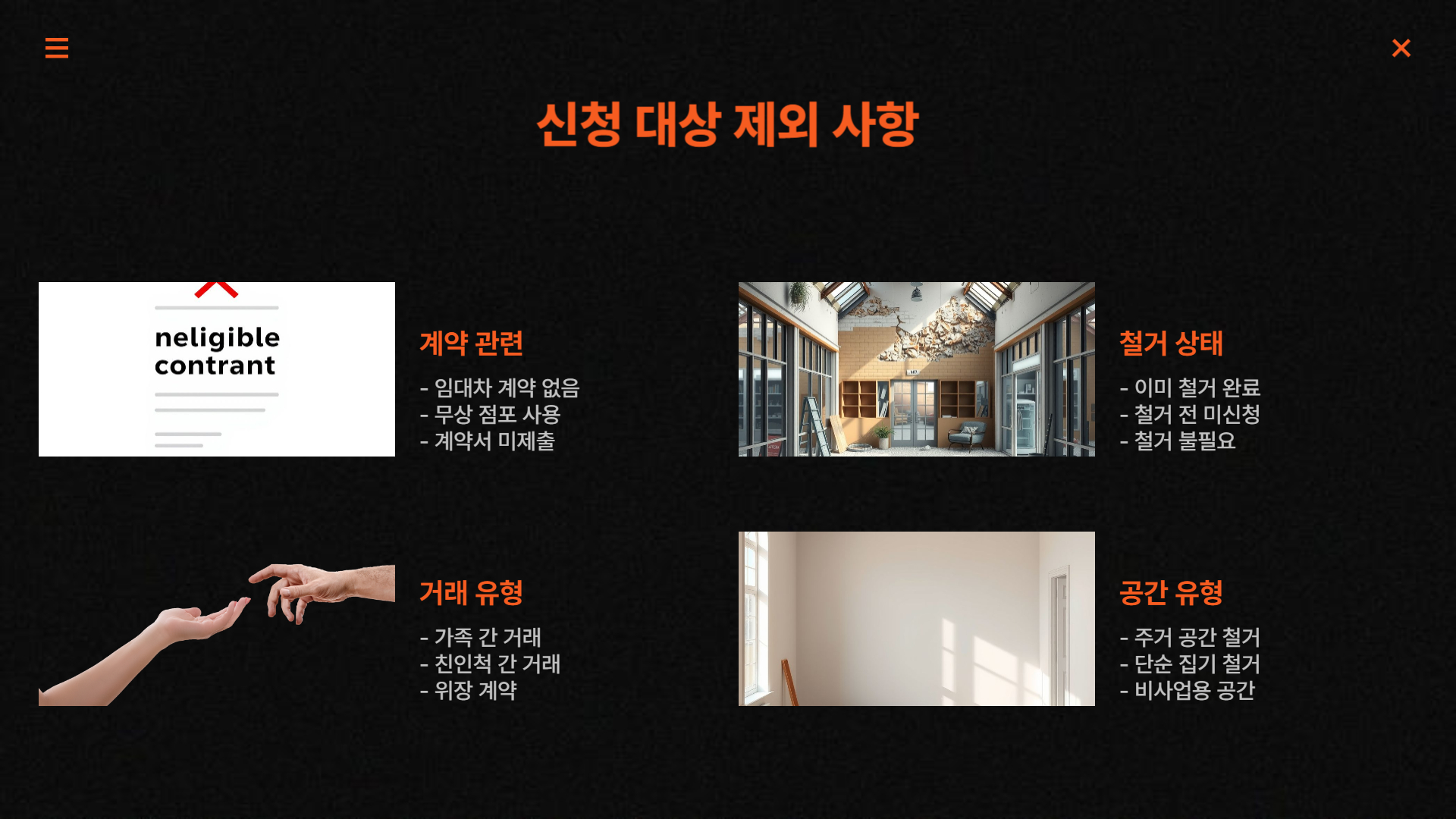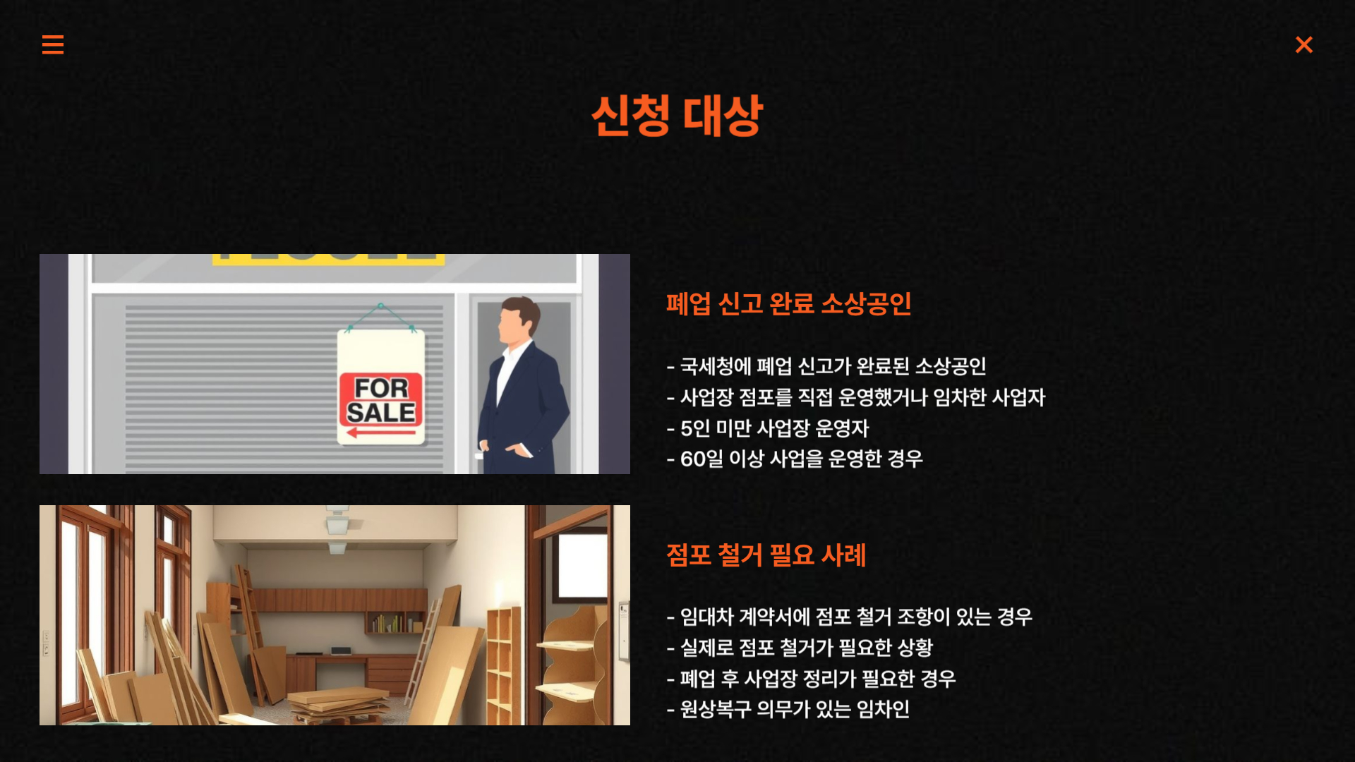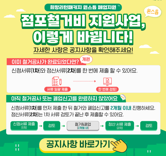 또한 폐업일 기준으로 지원이 이뤄지며, 점포 철.거비를 필요로 하는 점포형 사업장이 주 대상입니다. 폐업이 이미 완료되었거나 폐업 절차를 진행 중인 경우도 신청 가능합니다.