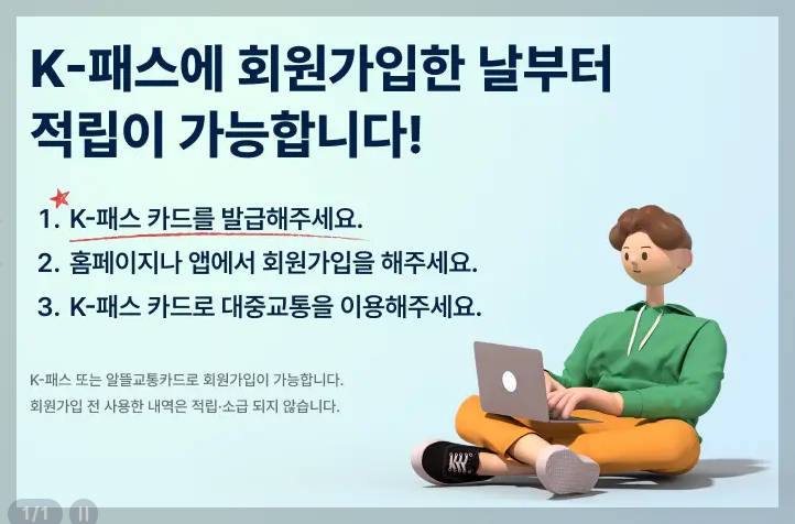 K‑패스는 홈페이지 또는 모바일 앱을 통해 가입할 수 있으며, 최초 로그인 시 카.드번호 등록, 휴대폰 본인 인증, 주민등록지 확인 등 기본 정보를 입력하게 됩니다. 기존 알뜰교통카.드를 보유한 경우, 별도 가입 없이 전환 동의만으로 연동이 가능합니다.